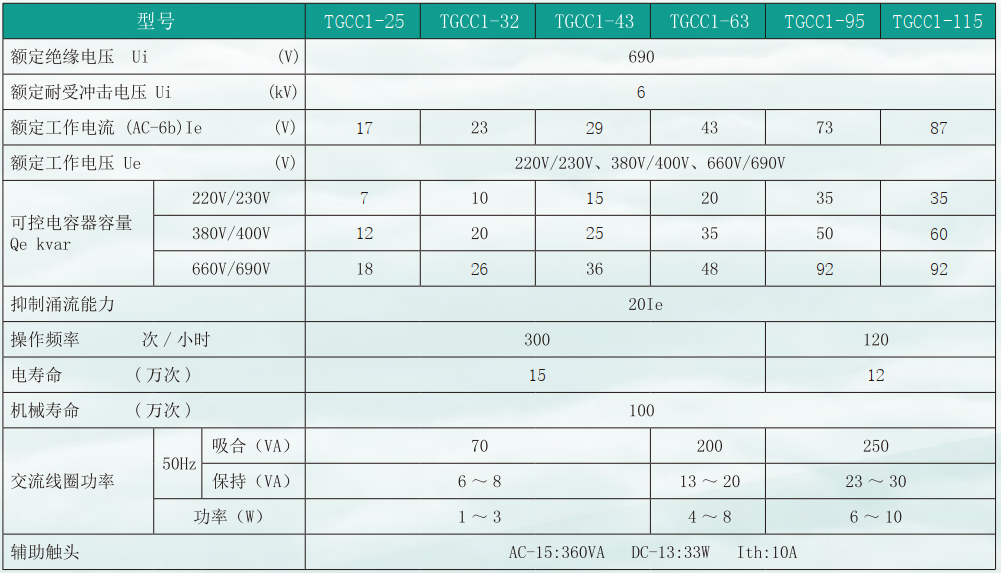 TGCC1 系列切换电容器接触器 ( 以下简称接触器 ), 主要用于交流 50Hz( 或 60Hz)、额定工作电压至 690V, 在 AC-6b 使用类别下可控制电容器容量至 50kvar 的电力系统中 , 接通和分断并联电容器,以作为改善功率因数之用。